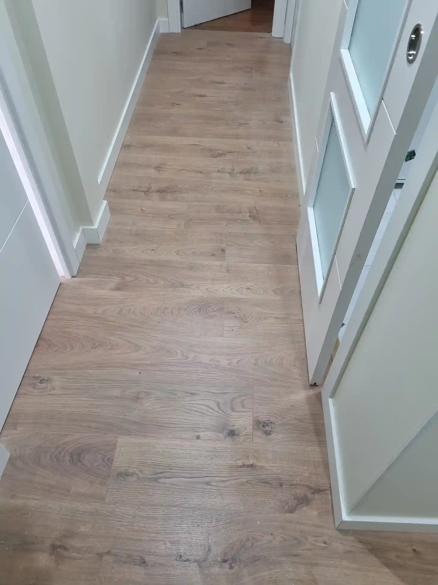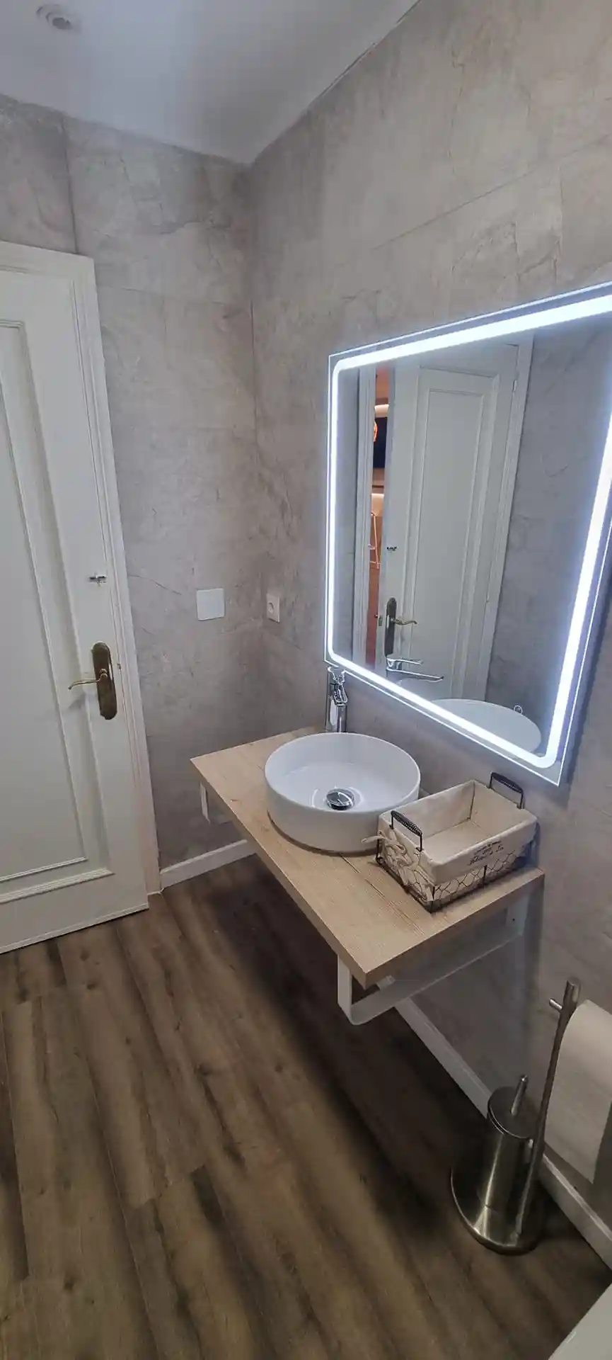 La reforma de la vivienda apuesta por materiales claros en la cocina y un pasillo en blanco que aporta luminosidad y amplitud. El suelo de roble oscuro aporta calidez y contraste, mientras que el baño, de diseño moderno, incorpora iluminación indirecta tras los espejos, creando un ambiente elegante y acogedor.