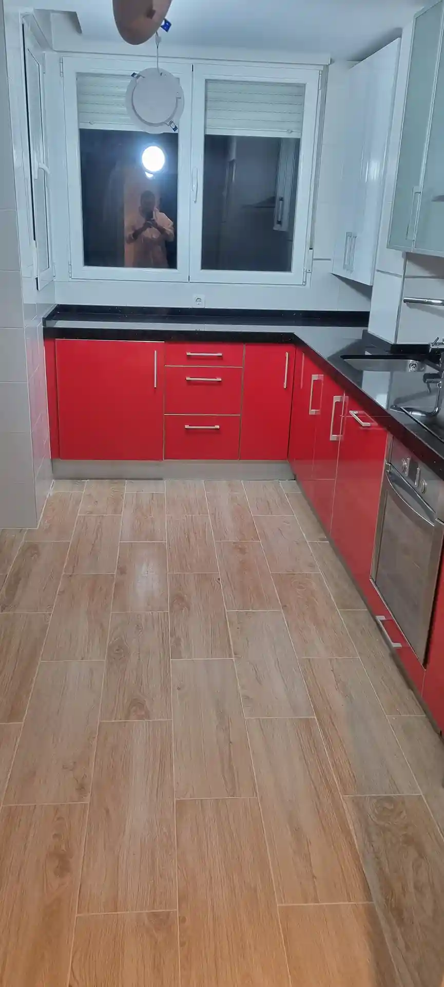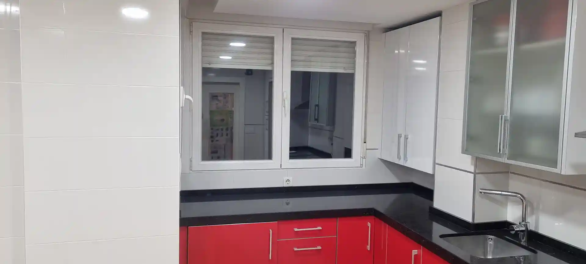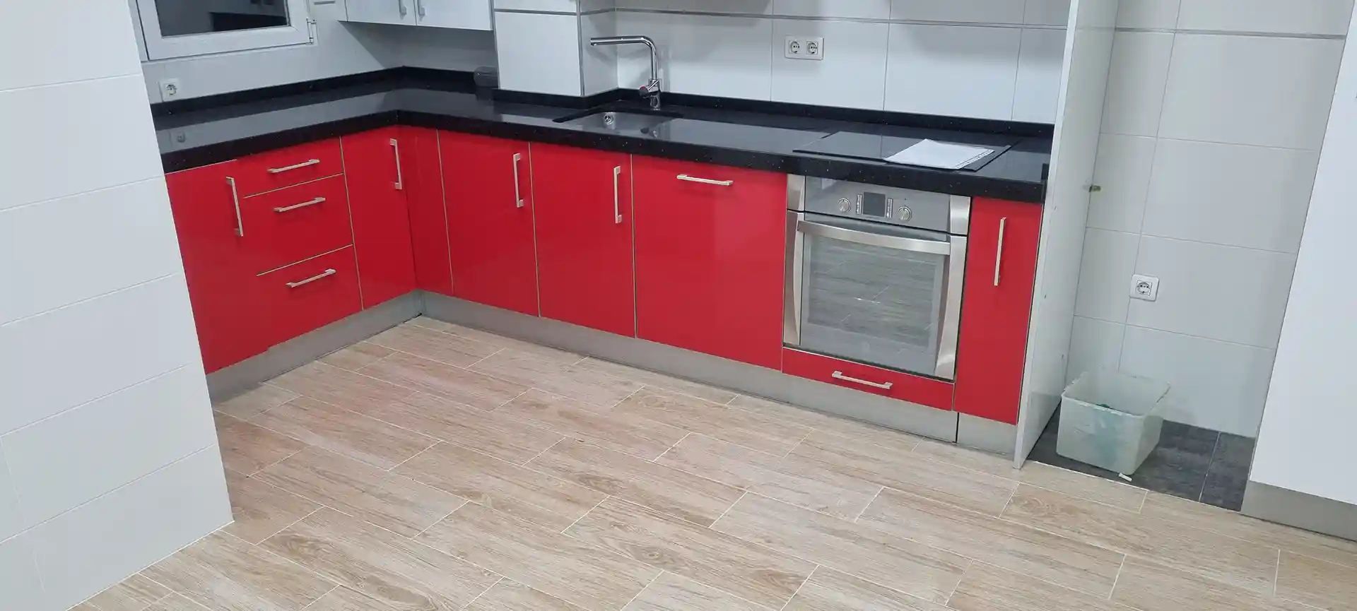 La reforma integral de la vivienda y la terraza apuesta por materiales claros en todas las estancias, potenciando la luminosidad y la sensación de amplitud. La cocina, con mobiliario rojo y encimera negra, se convierte en el punto protagonista, aportando carácter y un contraste moderno y elegante.